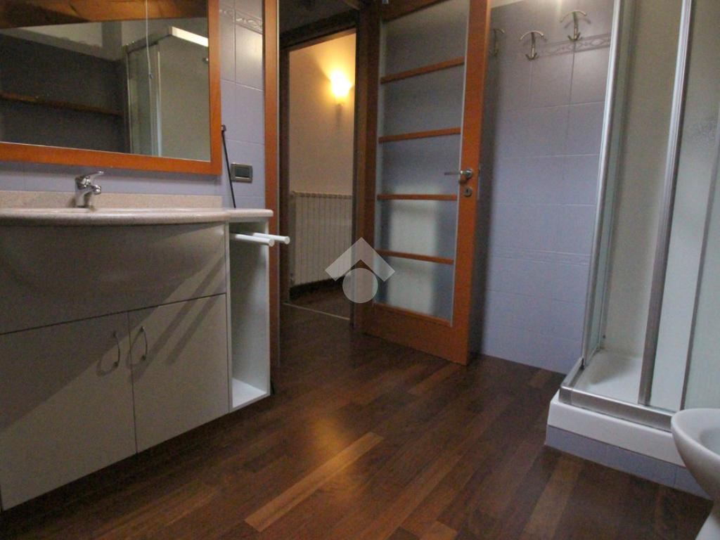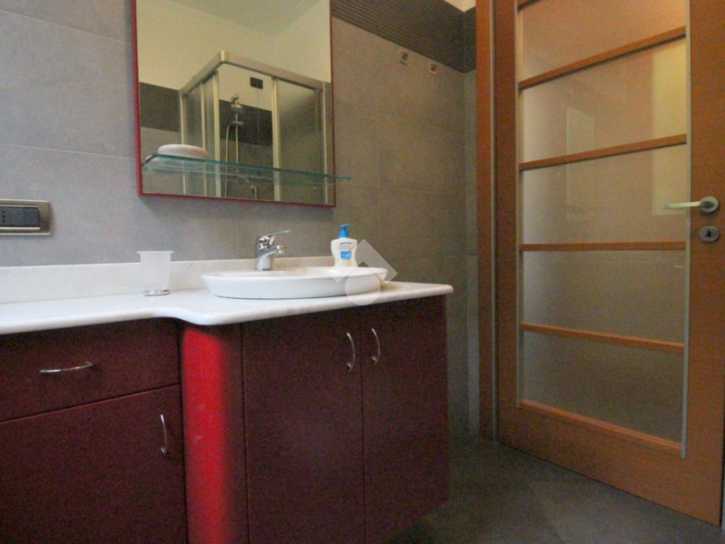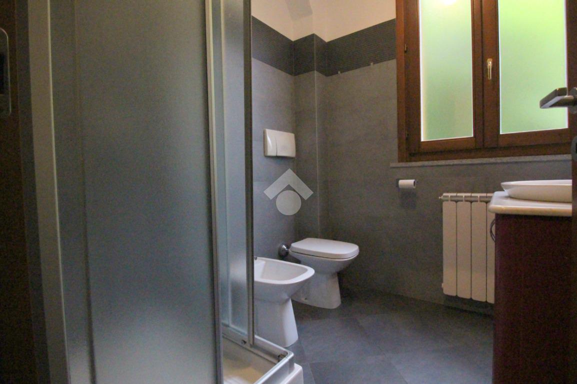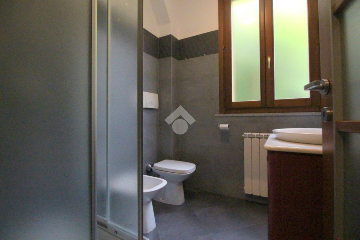 Dal disimpegno, utilizzabile come piccolo ripostiglio, dotato di attacchi per la lavatrice, si accede al bagno finestrato fornito di sanitari e doccia.