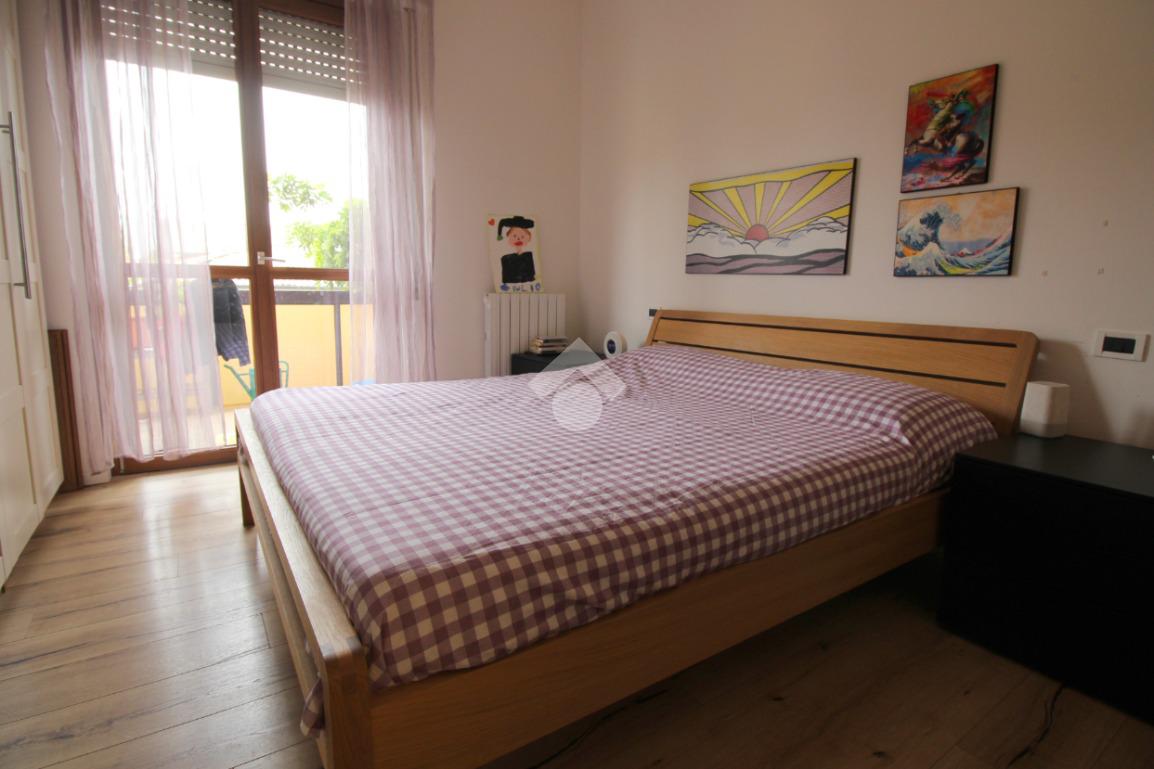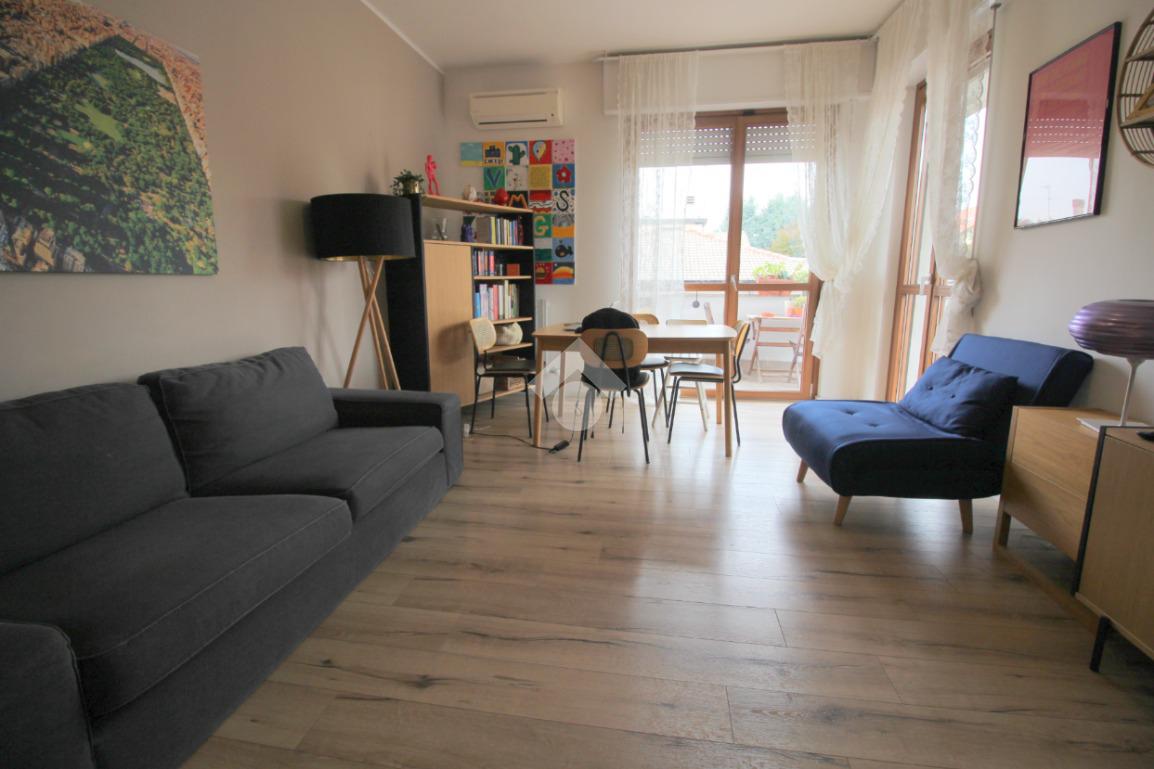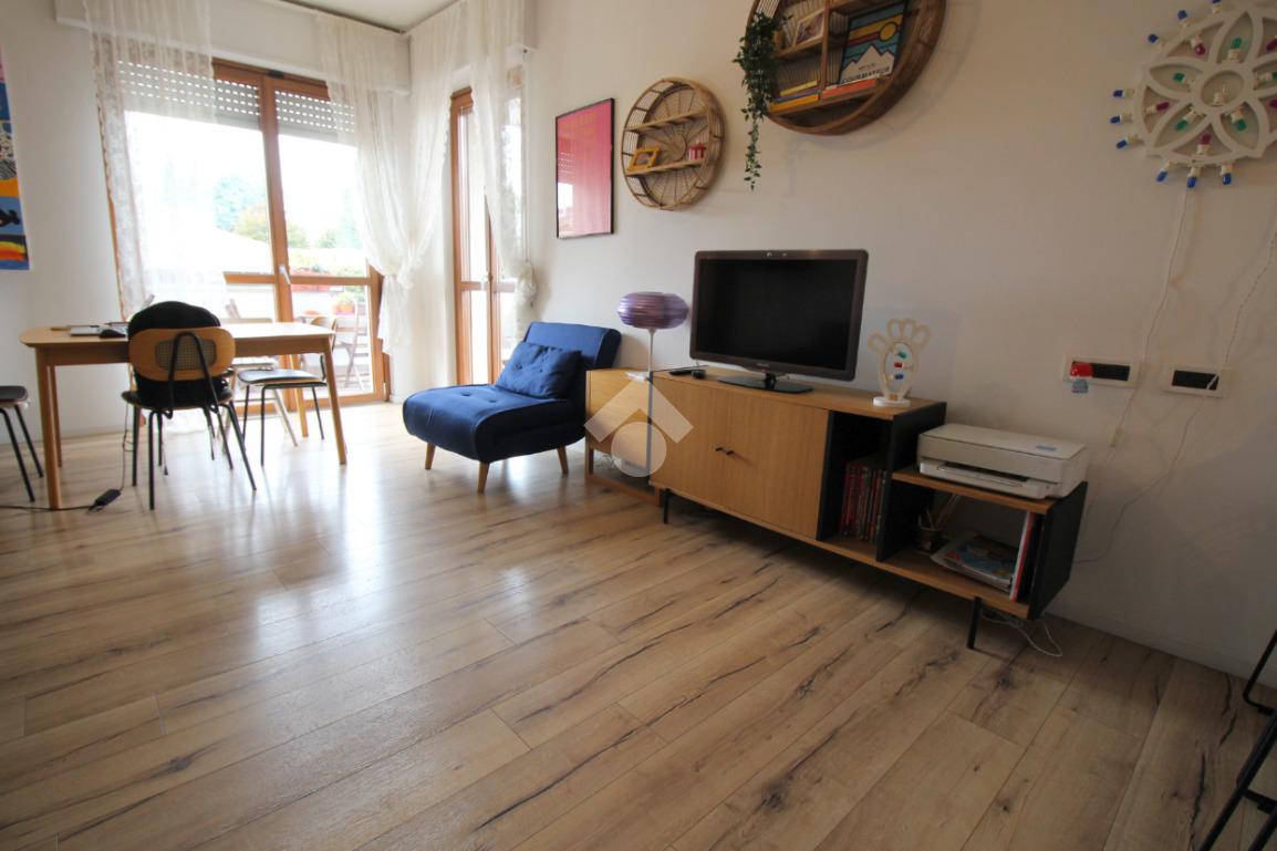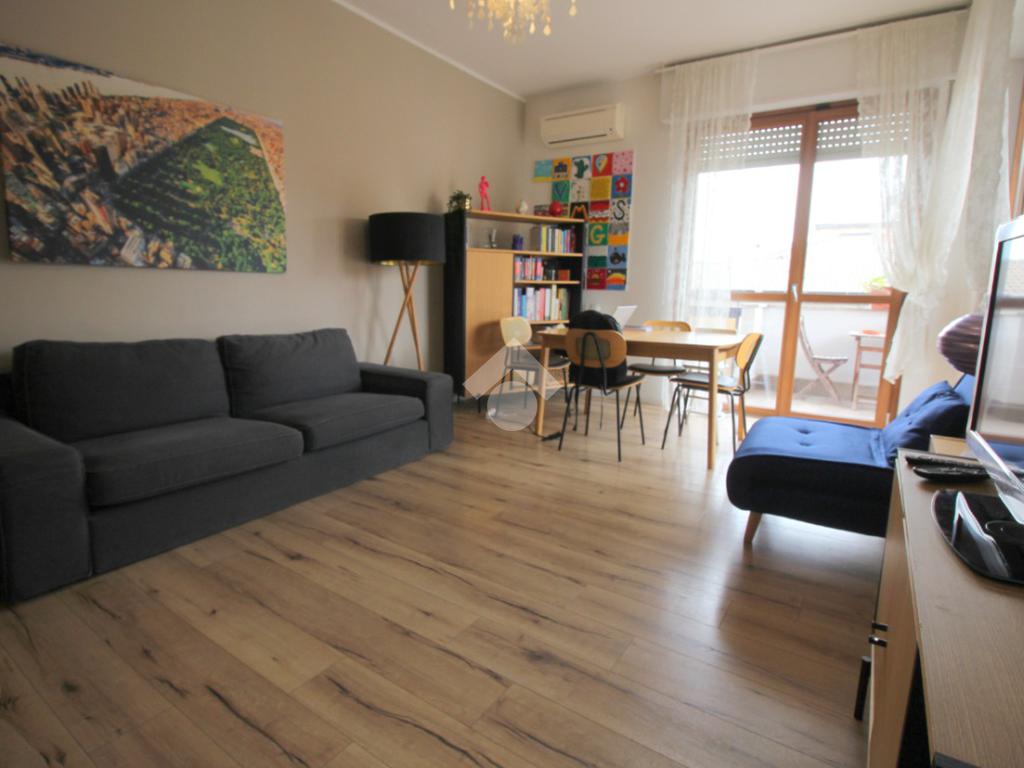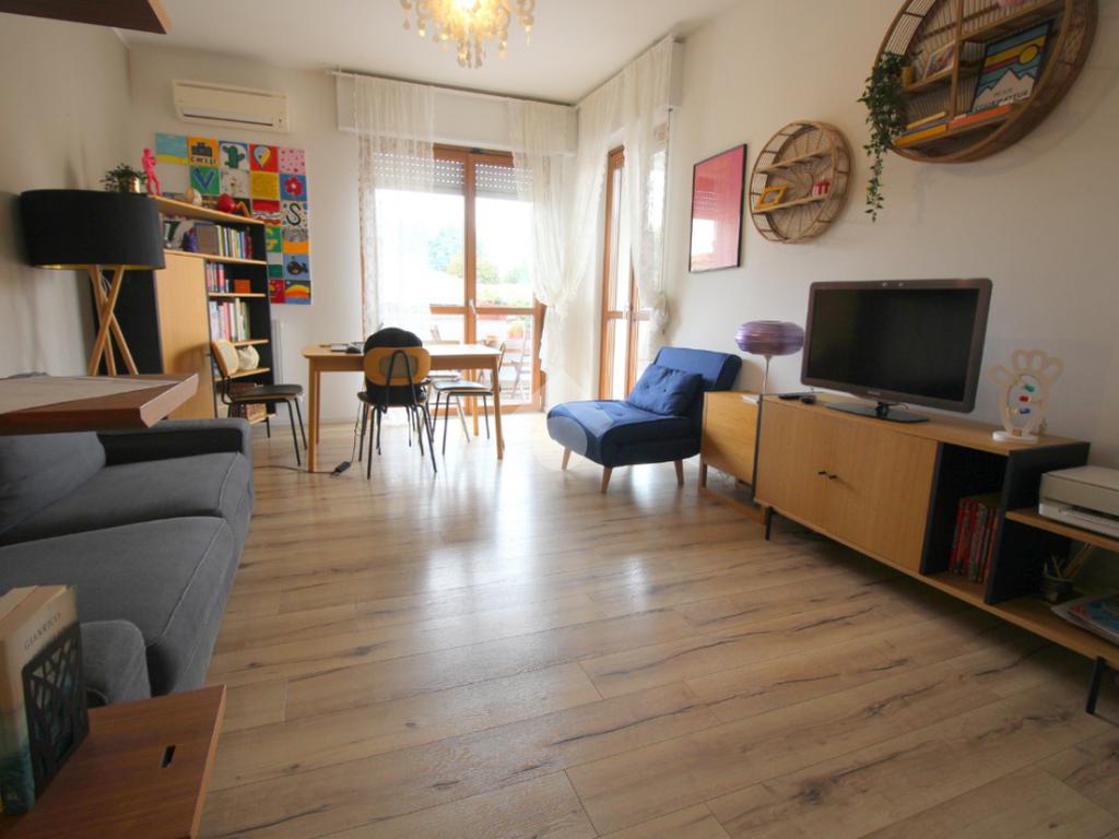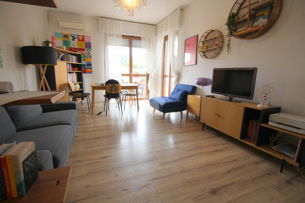 L’ingresso conduce al soggiorno, ideale per accogliere momenti di convivialità con familiari e amici, reso luminoso dalla doppia porta finestra che dà accesso al balcone.