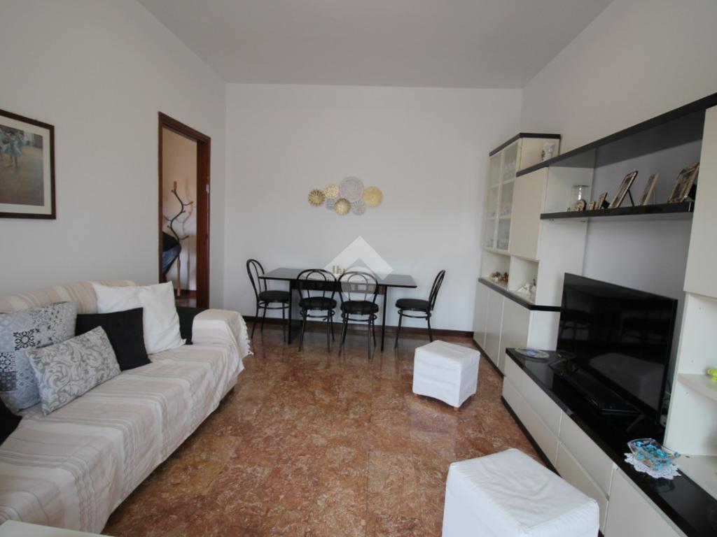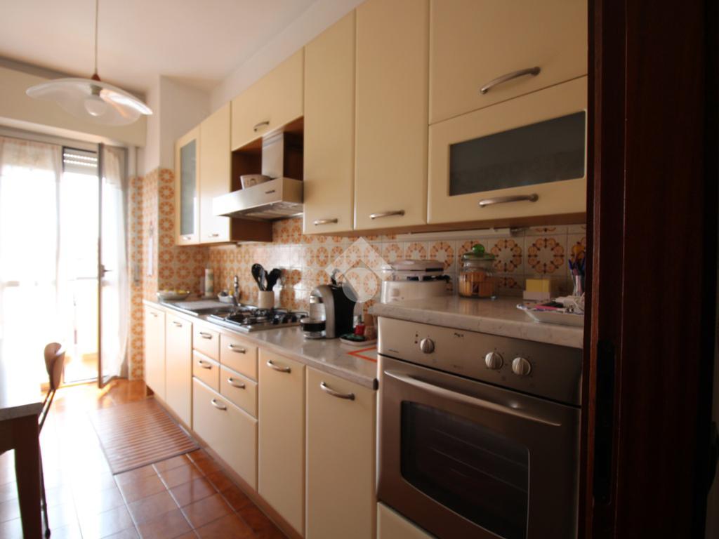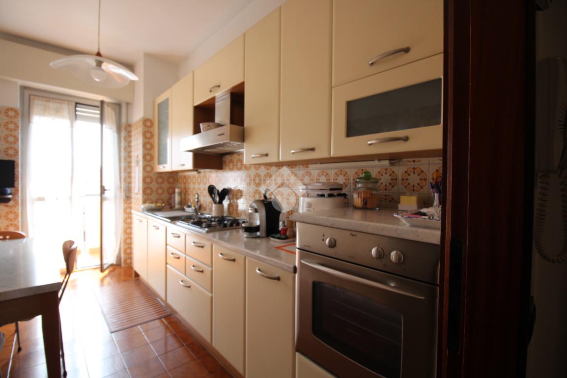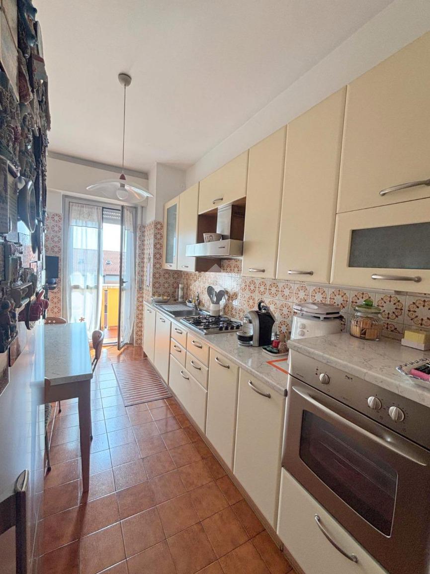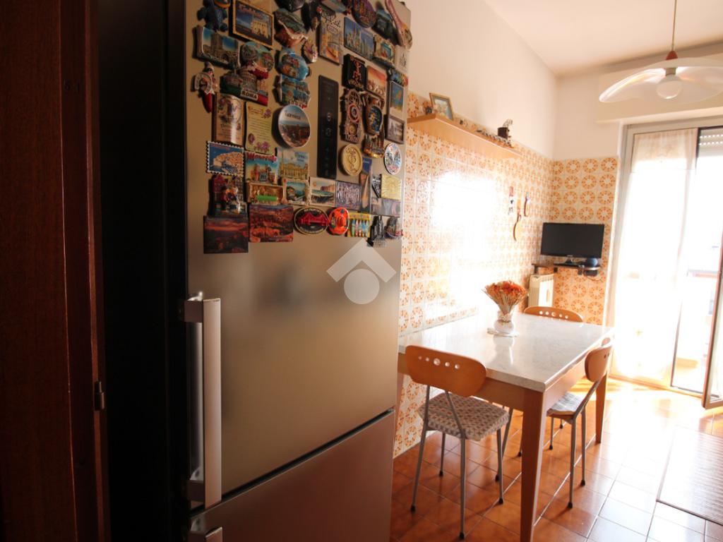 Dall'ingresso si accede al soggiorno dal taglio regolare che ospita un arredamento completo, dotato di porta finestra con uscita sul balcone ampio. La cucina è abitabile e permette di pranzare comodamente al proprio interno, anch’essa fornita di porta finestra con uscita sul balcone.