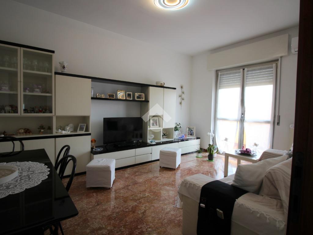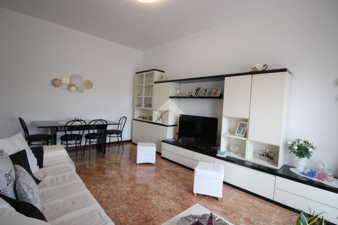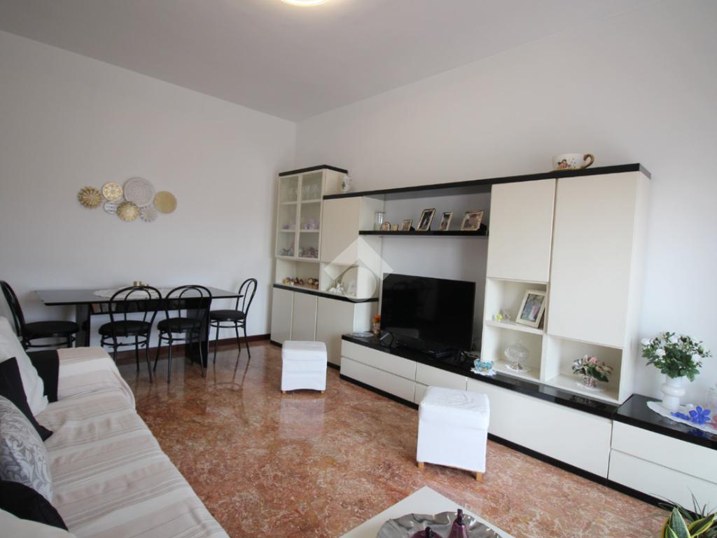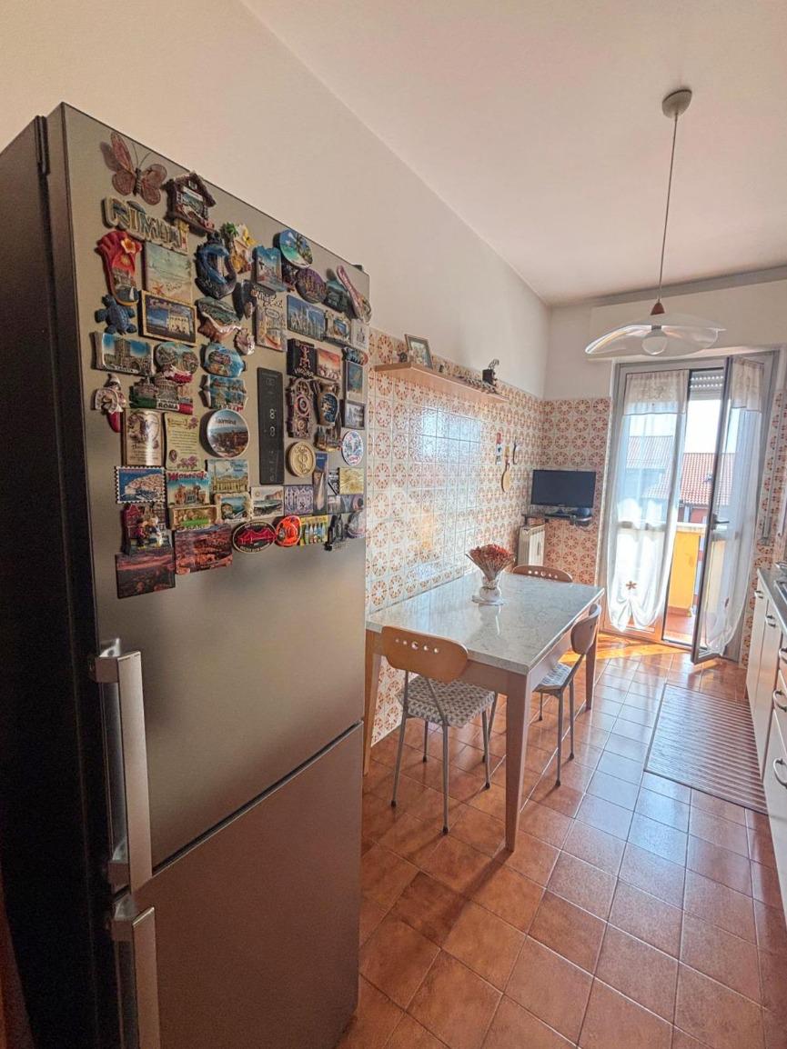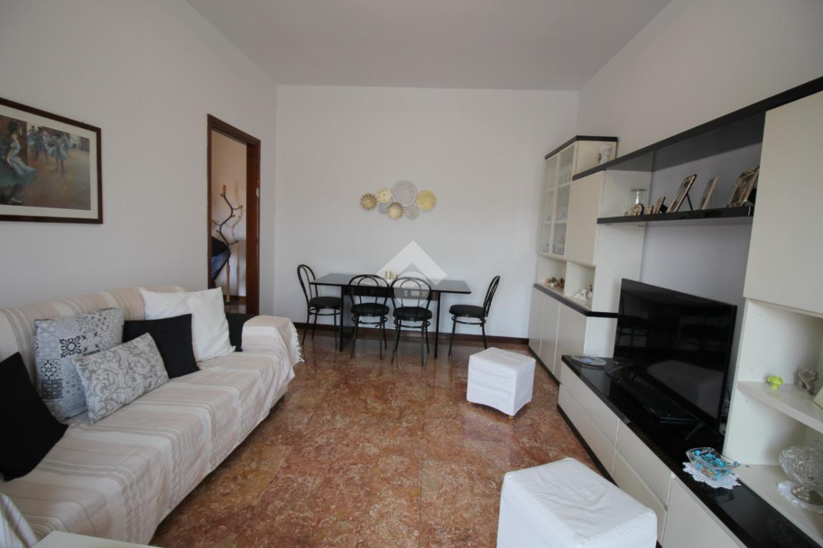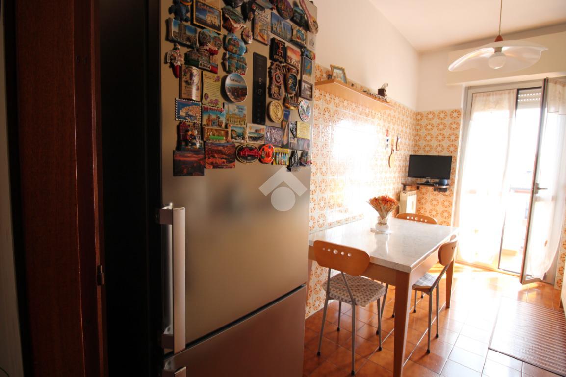 Dall'ingresso si accede al soggiorno dal taglio regolare che ospita un arredamento completo, dotato di porta finestra con uscita sul balcone ampio. La cucina è abitabile e permette di pranzare comodamente al proprio interno, anch’essa fornita di porta finestra con uscita sul balcone.
